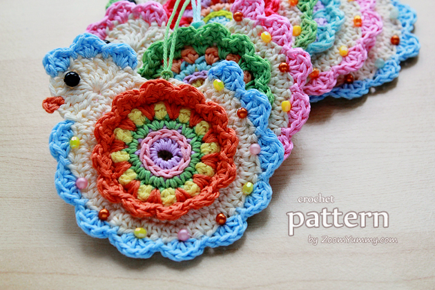 The cute colorful hanging ornaments that you can create with this pattern will be about 3 3/4 inches (9.5cm) wide.